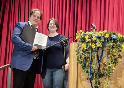 Annika Ruf, die am Nachmittag desselben Tages zur neuen Vorsitzenden des Blasmusik-Kreisverbands Stuttgart/Filder gewählt worden war, nutzte ihren ersten offiziellen Auftritt im neuen Amt für die Glückwünsche des Verbands zum Jubiläum. In ihrer kurzweiligen Ansprache hob sie die hervorragende Jugendarbeit und die engagierte Vereinsleitung besonders hervor. Sie überreichte einen Scheck in Höhe von 500 Euro – und zeichnete Dominik Wagner mit der Dirigentennadel in Silber des Blasmusikverbands Baden-Württemberg für seine 15-jährige Dirigiertätigkeit aus.